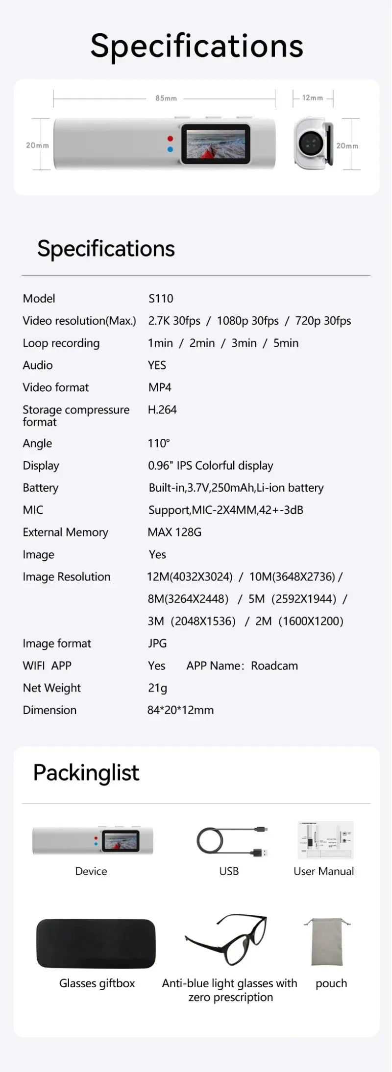 * Built-in large-capacity lithium battery 250mAH easily achieves 1 hour recording.